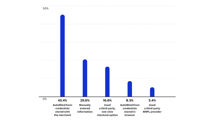 According to the latest Global Digital Shopping Index, 56% of shoppers choose merchants that offer fast, convenient payments.2 Being able to store credentials or use biometric checkout features play key roles in shortening the time to check out. Among respondents to the survey, 45% used credentials stored with a merchant to complete their most recent purchase.2